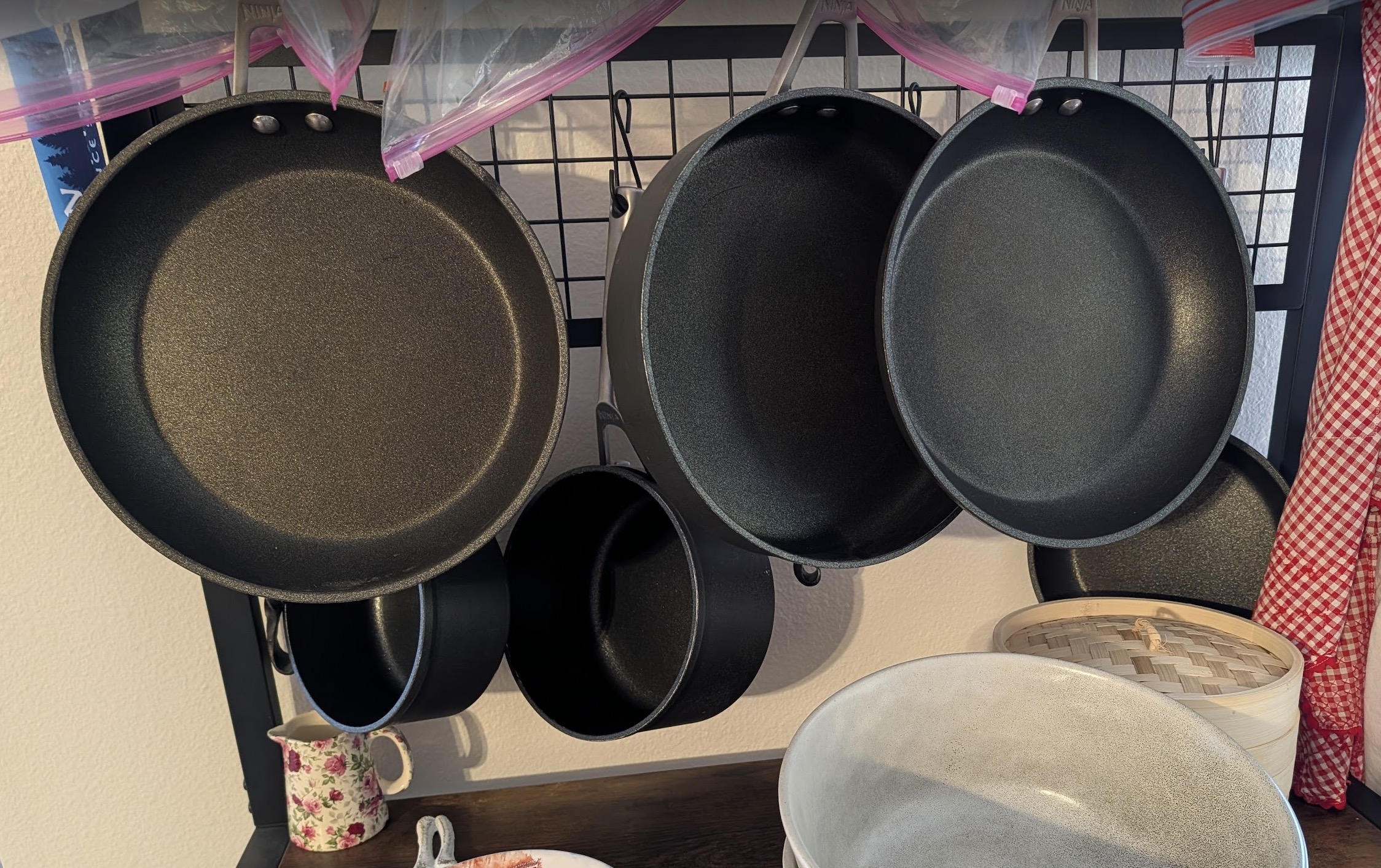 I had one tiny, one egg pan I kept. For cuteness. Hey, it’s red. Looks nice on the pot rack.