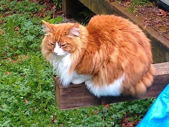 We were sitting out on the patio, I having just retrieved the chaise longue from the shed and the SO having turned the cushion over, when I heard a strange sound from Creamsicle. She came out from under the deck, and the SO said, ‘She caught a bird!’ Creamsicle brought it over to ‘mom’, who made her release it. The bird flew away apparently no worse for wear.