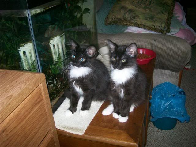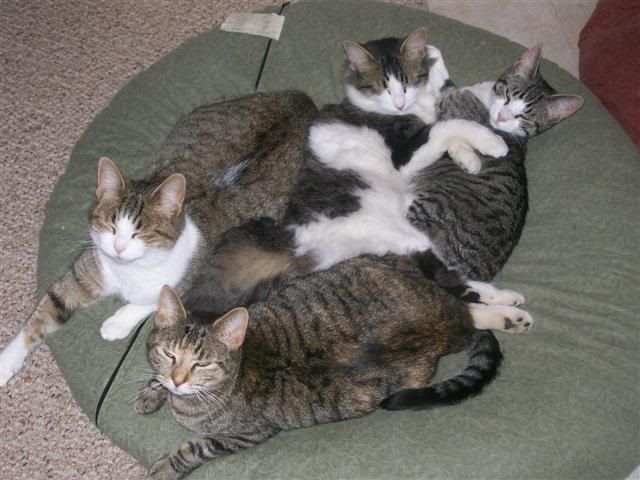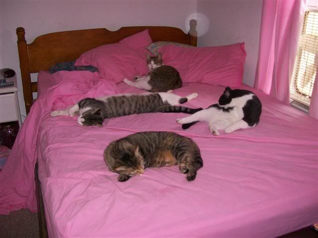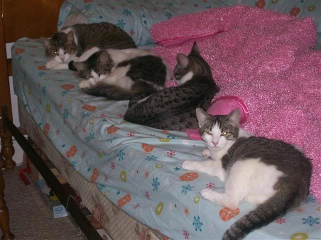 Elwood, Bob, Schmee and Button are always in bed with me at night. Jake, Moochie, Gizmo and Keekers will make an apperance in the middle of the night several days a week.