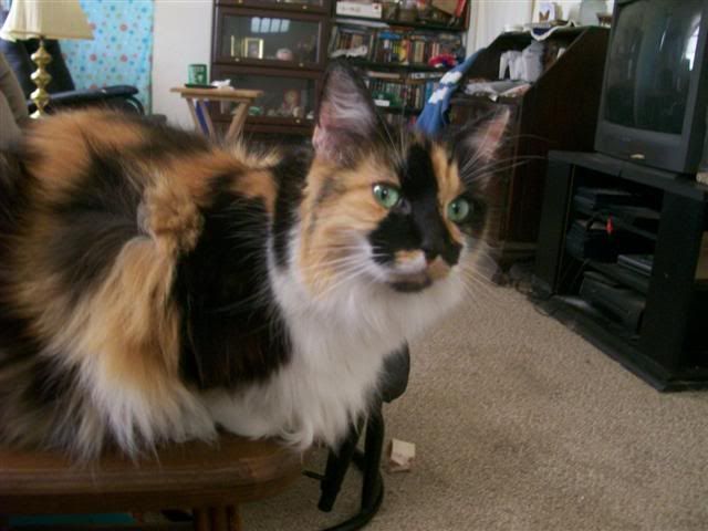 Schmee: Love the white markings, especially on the face. Keekers: She must put in a lot of grooming time to stay so clean. Gizmo: Ha! My Peanut and your Gizmo need to visit a kitty fat farm! Pugs: Awe, a longhaired calico! They’re so beautiful. I had one years ago – her name was Tribble.