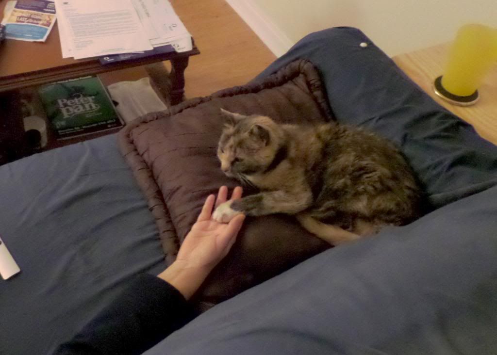 (She’s all about sticking her paws on us these days - I was sleeping with her beside me the other day, and she stuck her paw on my nose!)