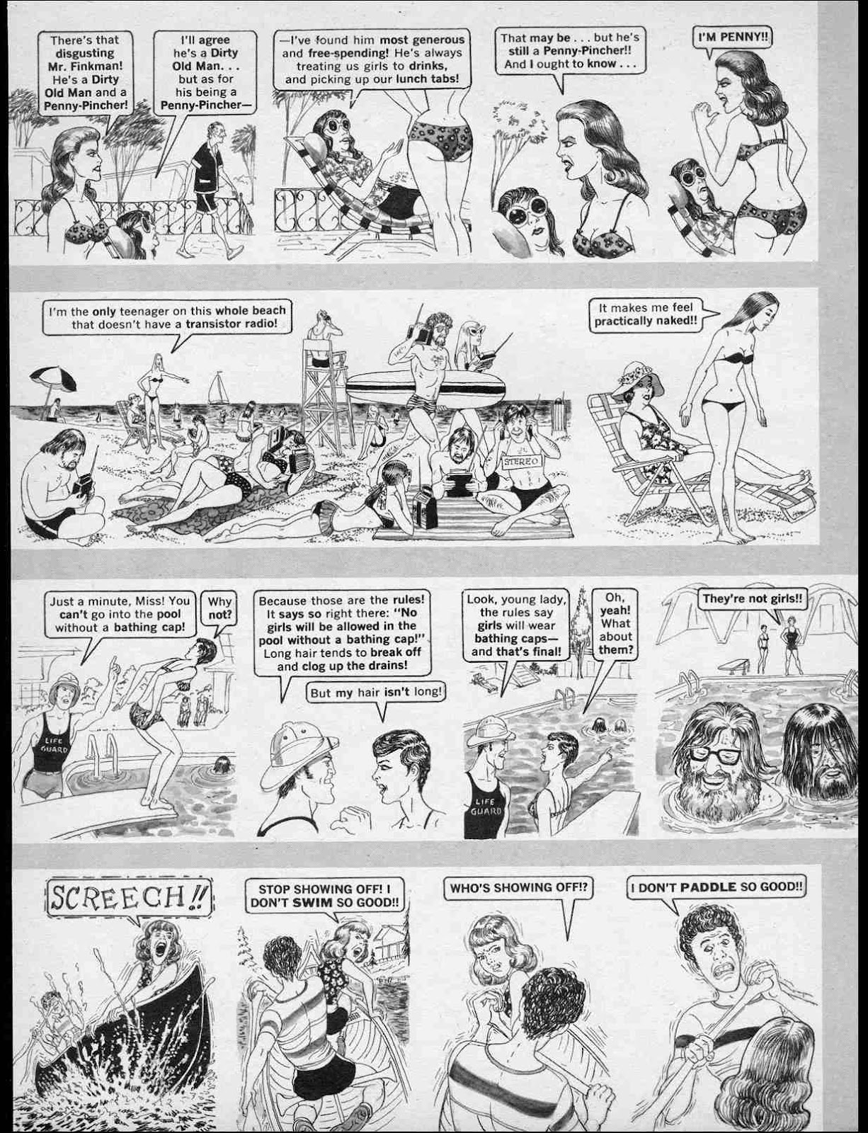 A teenager\young woman is complaining that she forgot to bring her transistor radio to the beach. In the last panel she says, “I feel practically naked without it.” Her bikini has no bottom, and they show it from the front. I swear I saw this in the early seventies, but this seems a bit risque for MAD.