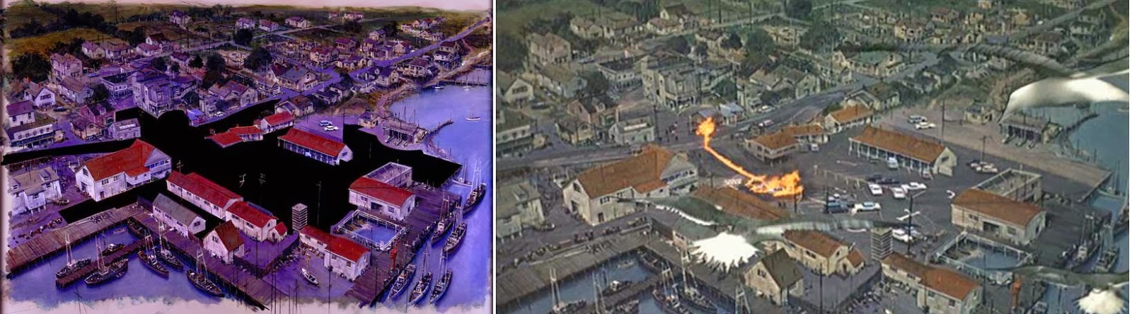 One of my favorite matte shots is the scene in The Birds when the car blows up and the camera pulls back for a “bird’s eye” view. By today’s standards it’s a really simple technique, but that aerial shot of the town erupting into chaos still packs an emotional punch. (link to “before and after” image)