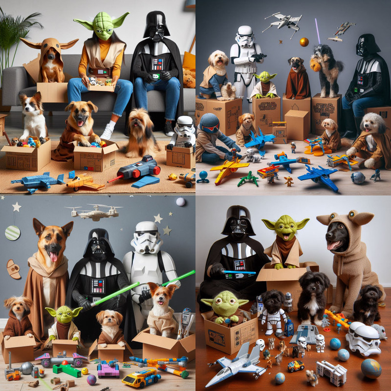 As an aside, after some minor probing I haven’t seen much evidence that Bing/DE3 knows a style for Bluey. One set of images includes dogs, but it also includes boxes so I suspect that B/DE is trying to interpret the tokens as “Chewy”.