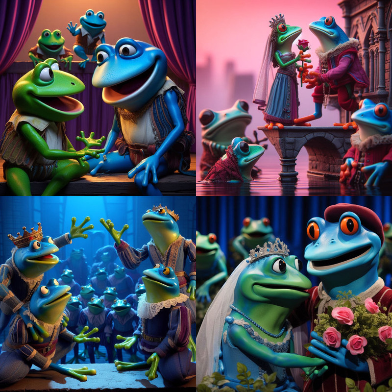 Frogs staging a production of Romeo and Juliet in the style of Bluey