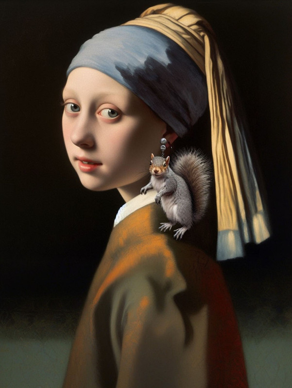 Prompt was “Vermeer’s girl with a novelty squirrel earring. She has a grey squirrel on her ear.” and was my 6th try.