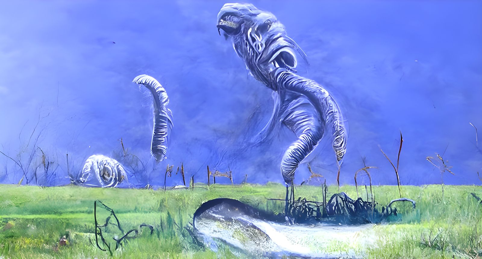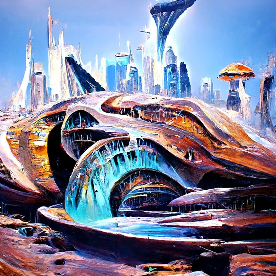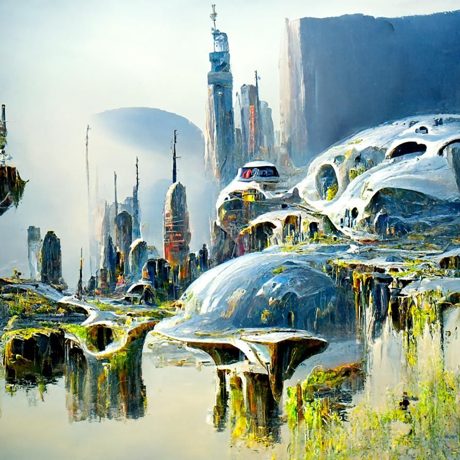 I’m only going to single out one image from the group to highlight individually. It is my favorite out of several that rise to the level of brilliance. It came out of “mushroom village” and the “horror” preset, believe it or not. (It sure looks like an alien city, though.)