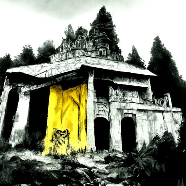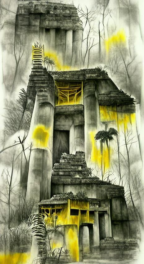 Temple of Gold | Yellow | Grayscale | Exterior Shot | Jungle | Abandoned Temple | God Rays | Ink Washes