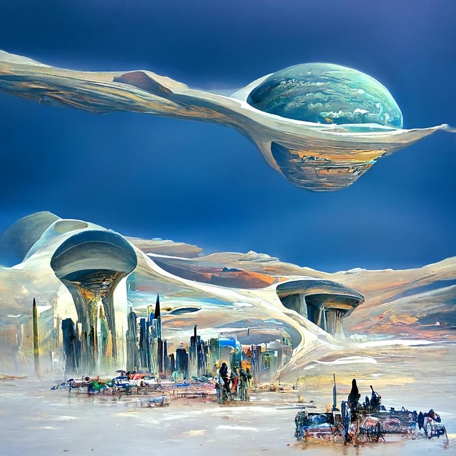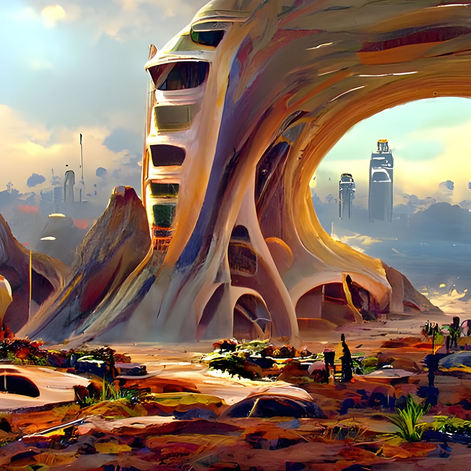 Okay, mushrooms. I decided to dump most of them in a gallery instead of filling space here with a long string of them. Basically I take cut-out mushroom photos, paste various numbers of them on an extremely simple background, then run it through with various prompts and modifiers. Usually something like “mushroom village” but sometimes something like “alien city”. (I once tried “something boring” and got something a bit like Howl’s Moving Castle in the midground, a sign in the foreground, and a dome in the background.) I have tried a panorama-level widescreen with 7 mushrooms, but that turned out to disappear some of the thinner trunks unless I did medium-res, 3 credit renders, leaving floating buildings (which is okay for some renders anyway) so most of them are narrower. Some are highly upscaled, some not depending on the credits I had available at the time.