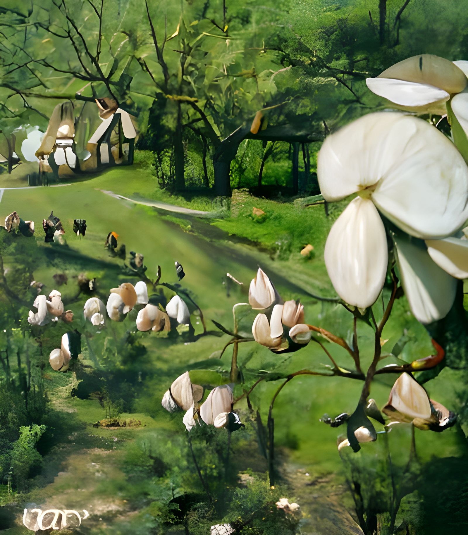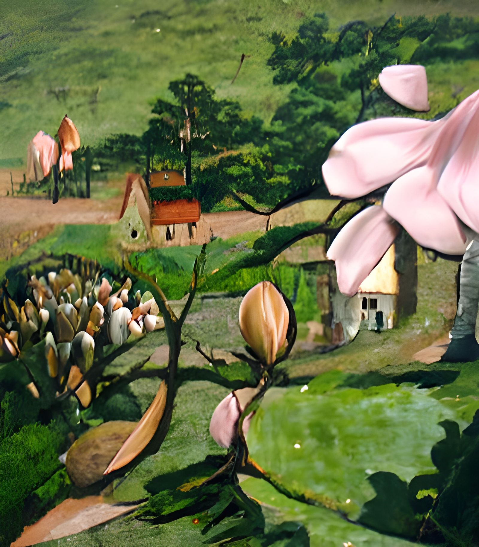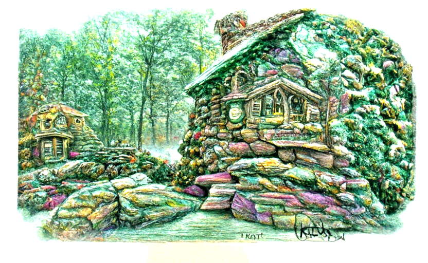 Here is “a beautiful stone cabin in the green woods, by Thomas Kinkade, hyperdetailed colored pencil drawing”