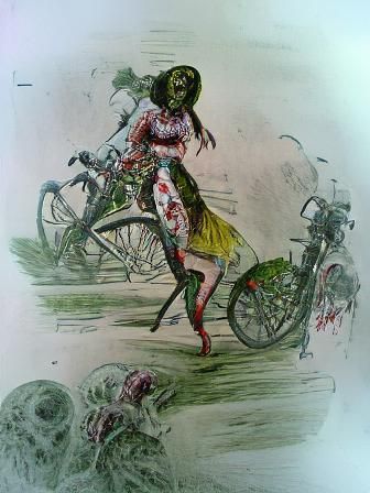 Zombie Woman on a Bicycle | Style of Jules Cheret, Lithographic Style, Highly Detailed