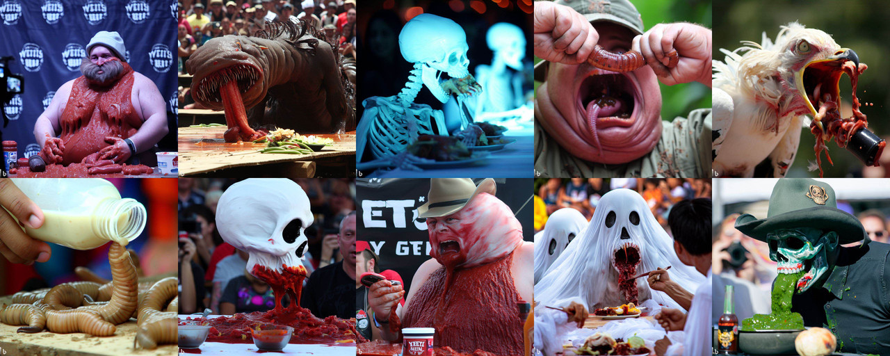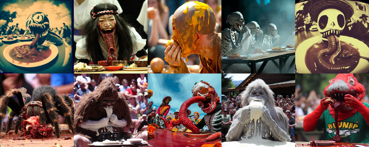 I finally signed up for a Microsoft account so I can access Bing Create. The output is just strikingly different than other systems, even Dall-E 2. I had been seeing images of “x eating contest” and they were awesomely awful. Here are some of mine (I found adding “red sauce” helps make things more interesting, such as the prompt “ghost red sauce eating contest”.)