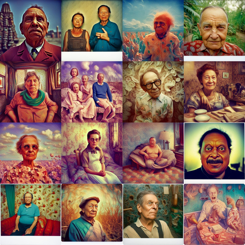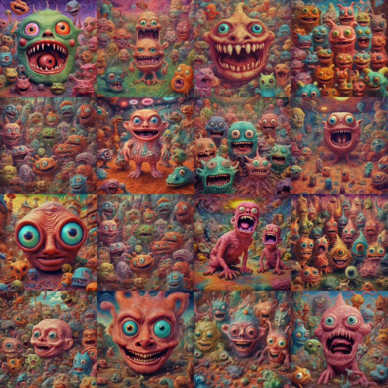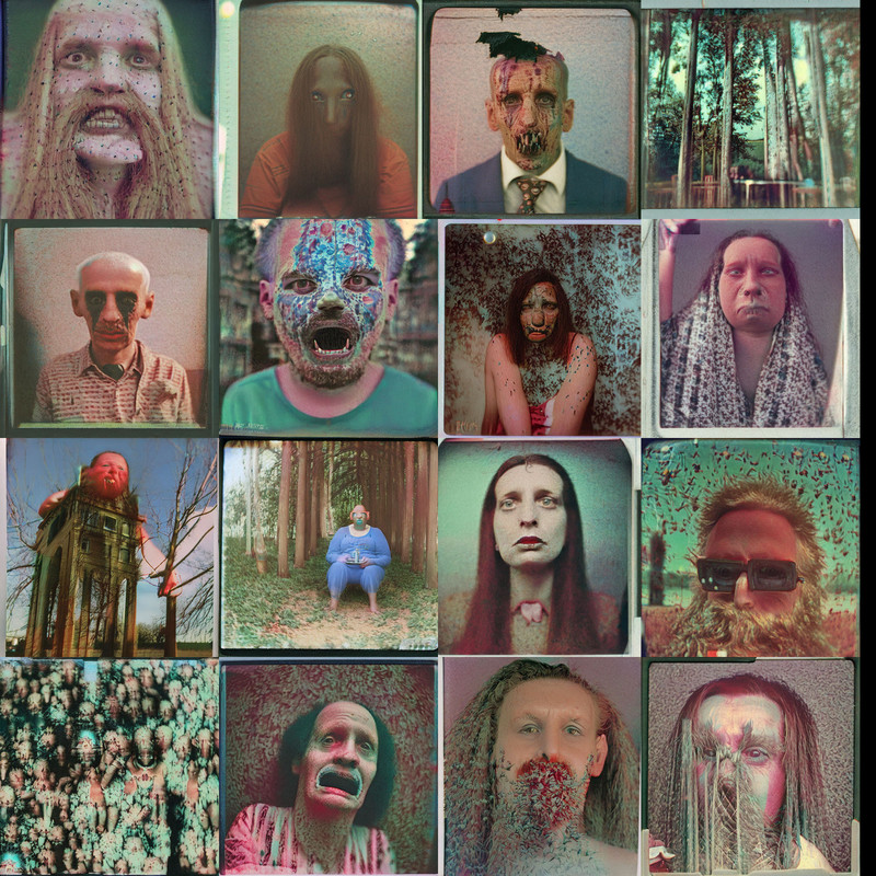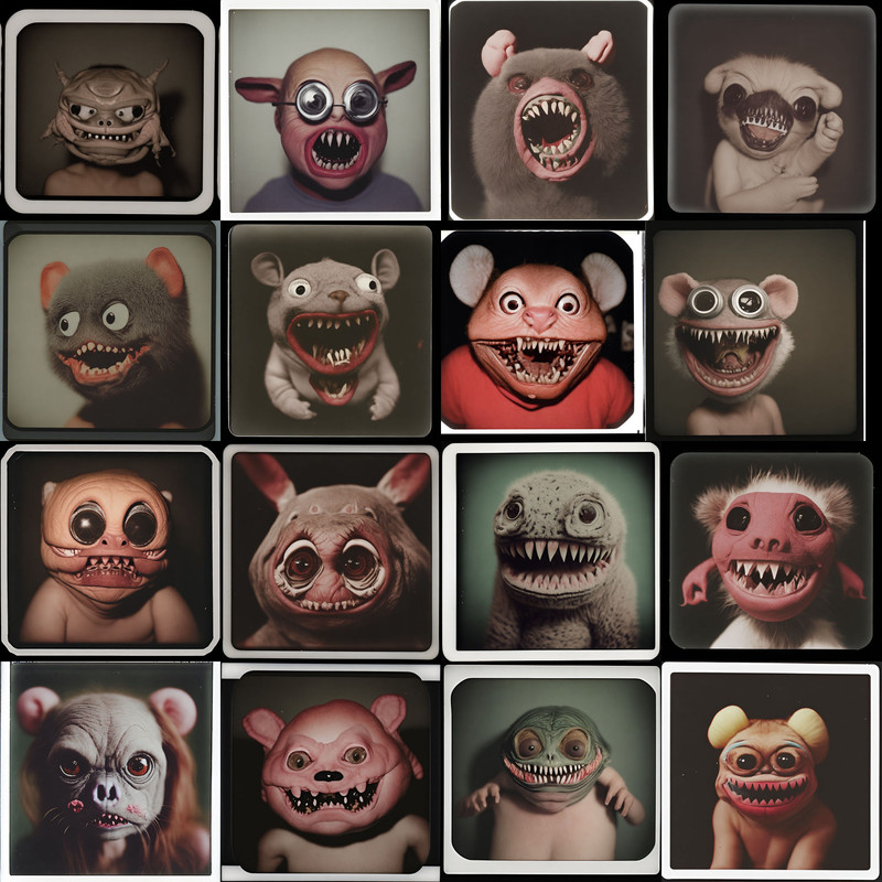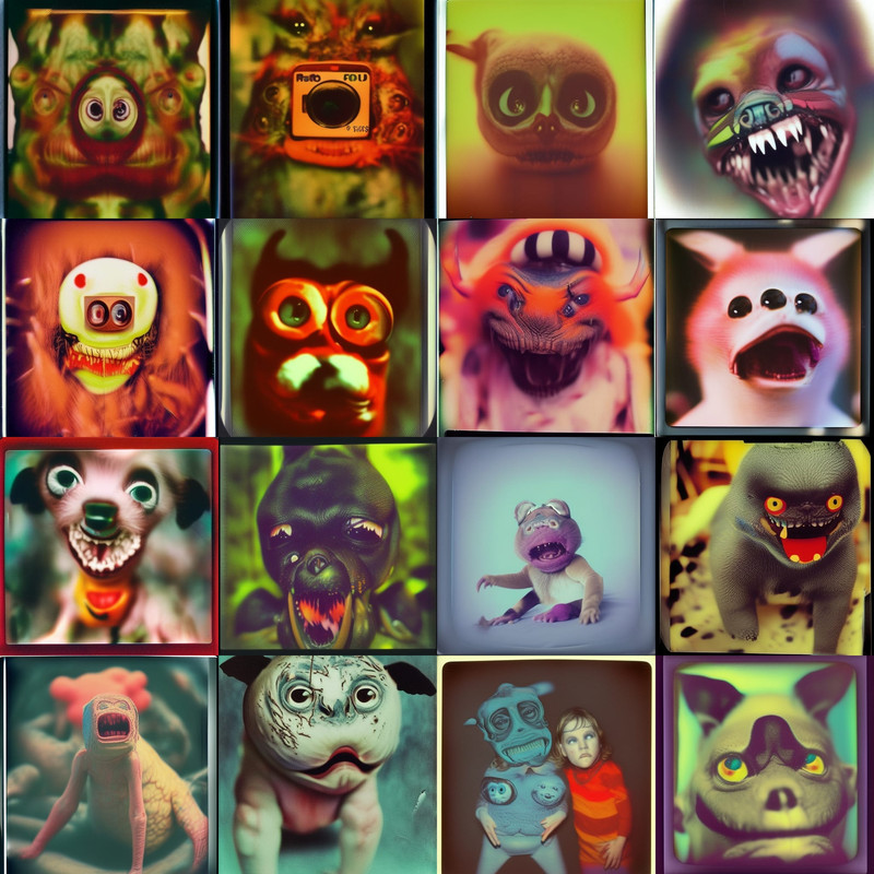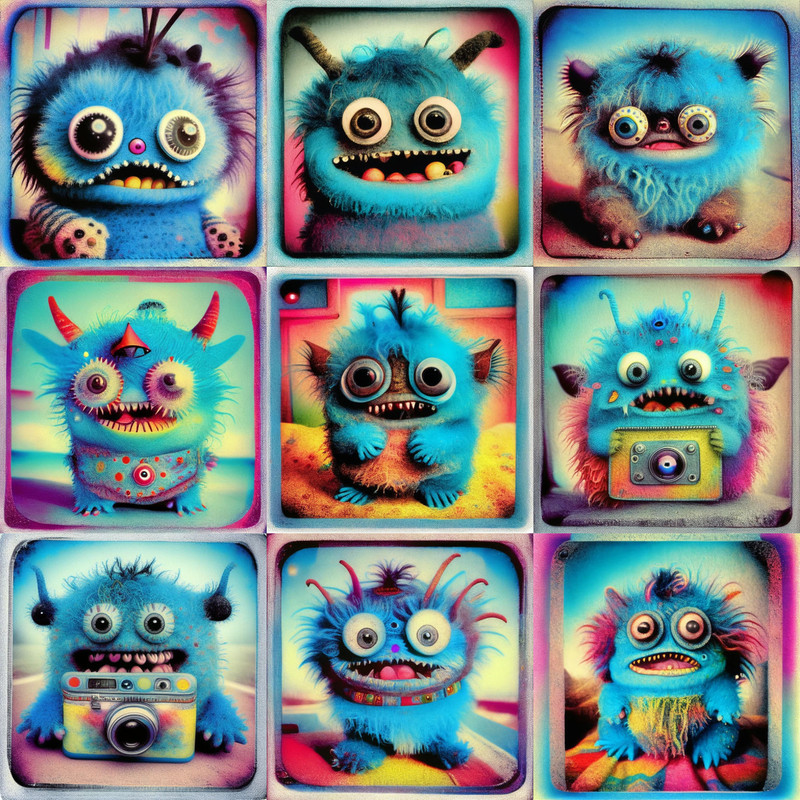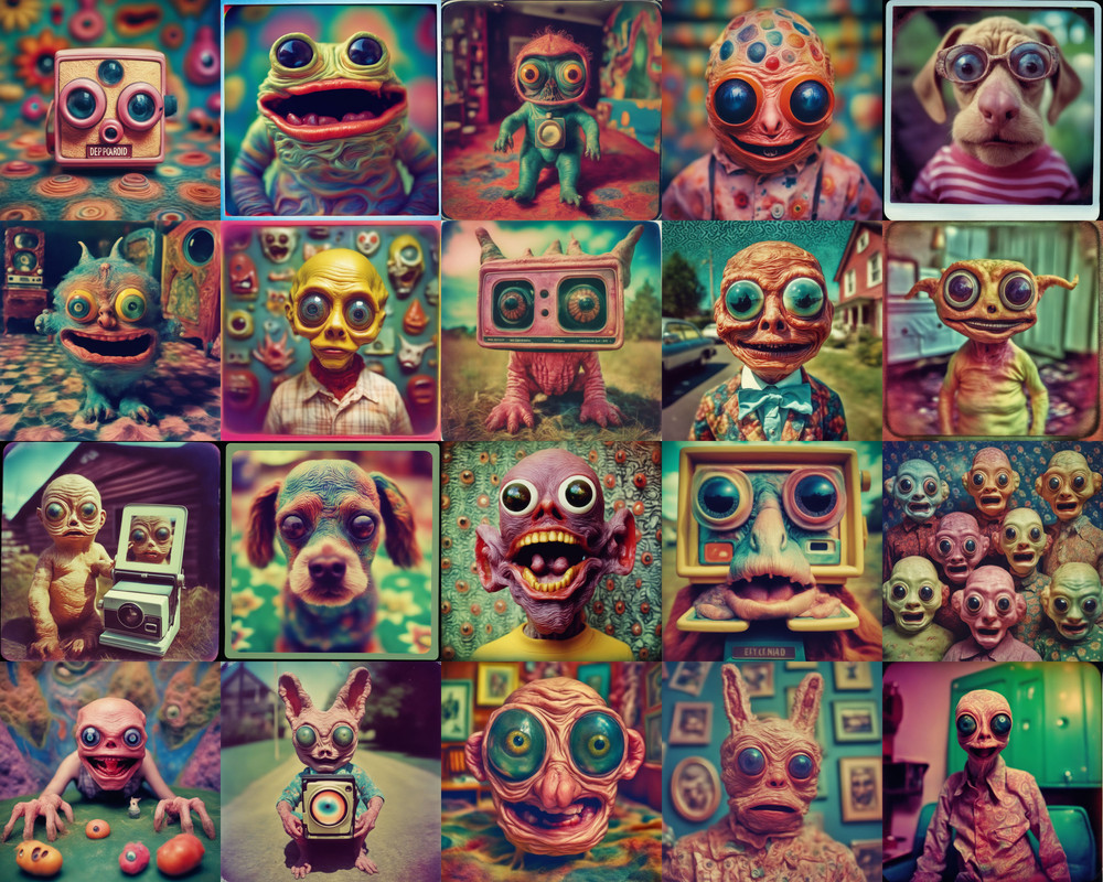 As much as I like these (and I made generated dozens more than this set) I wanted to try for some without a few of the images containing cameras and a lot of them containing creatures with lens eyes. I tried the same prompt except without “polaroid” and ended up getting much different images: