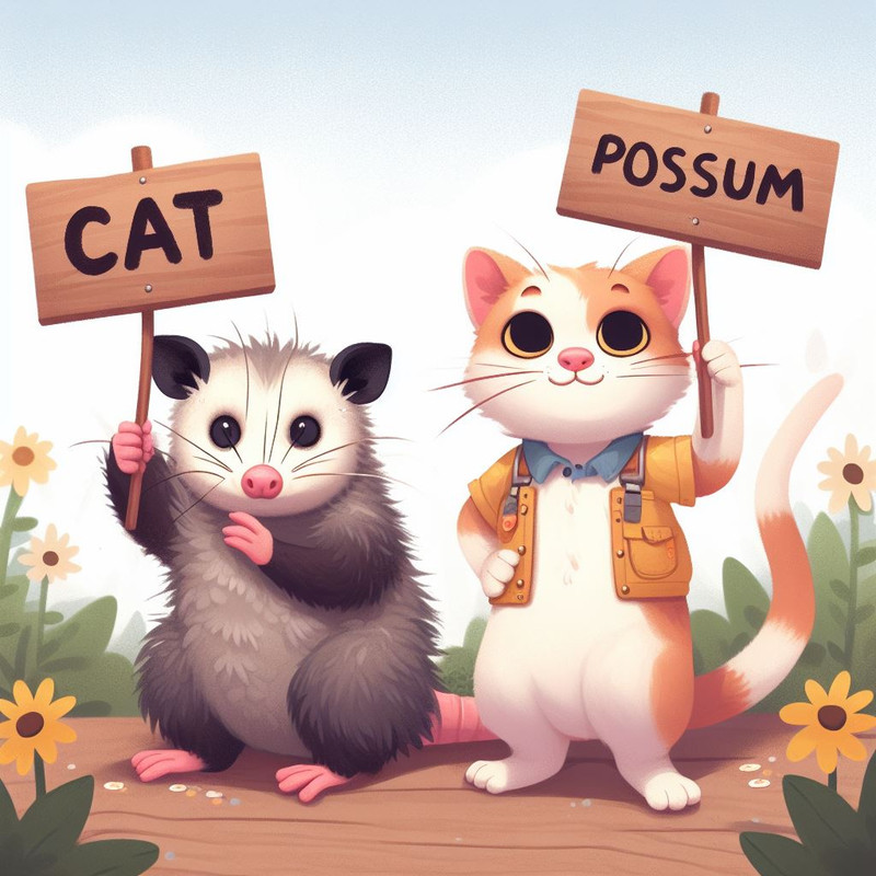 About understanding more complex prompts, one of my first tests was "a possum holding a sign that says “cat” and a cat holding a sign that says “possum”.