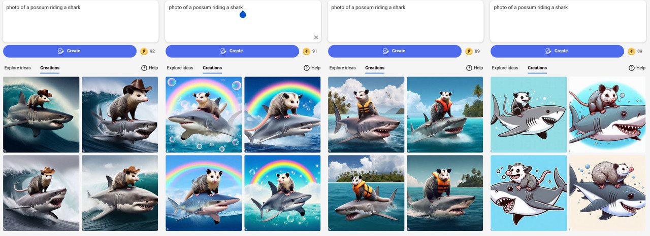 Dall-E 3 has been added to Bing, and it is weird. It produces some pretty amazing images, but it seems to like adding odd, unrequested items to prompts, clumped together in “themes”. I’ve just started playing with it, but for example in this simple prompt for a photo of a possum riding a shark, in one set all of the possii have cowboy hats, in another they are all wearing life vests, in a third there are rainbows and bubbles and in a forth all are drawings.