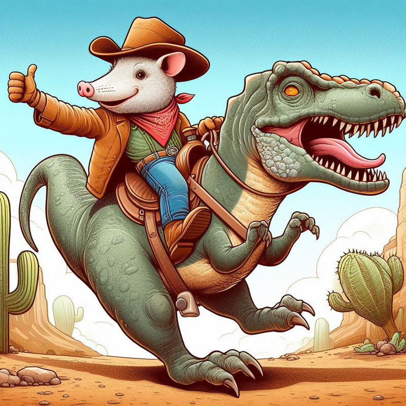 This is reaching the “ready for prime time” stage. (One failure, though: asking for the possum to be riding a brontosaurus or apatosaurus also generated images of a possum on a tyrannosaurus or Spielberg-style velocitaptor.)