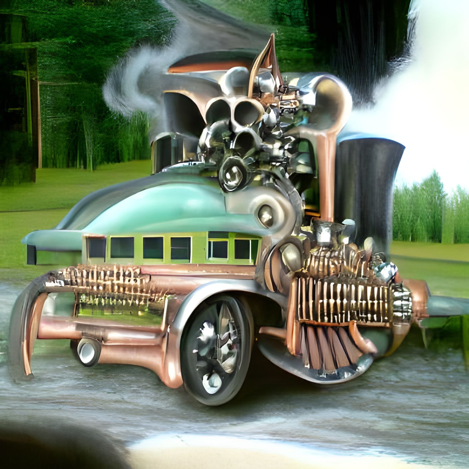 Huh. I entered Psychobilly Cadillac – as in Johnny Cash’s "One Piece at a Time – for Steampunk style and it gave me something along the lines of an Art Deco railroad engine.