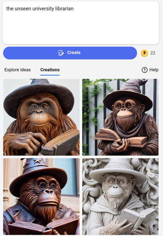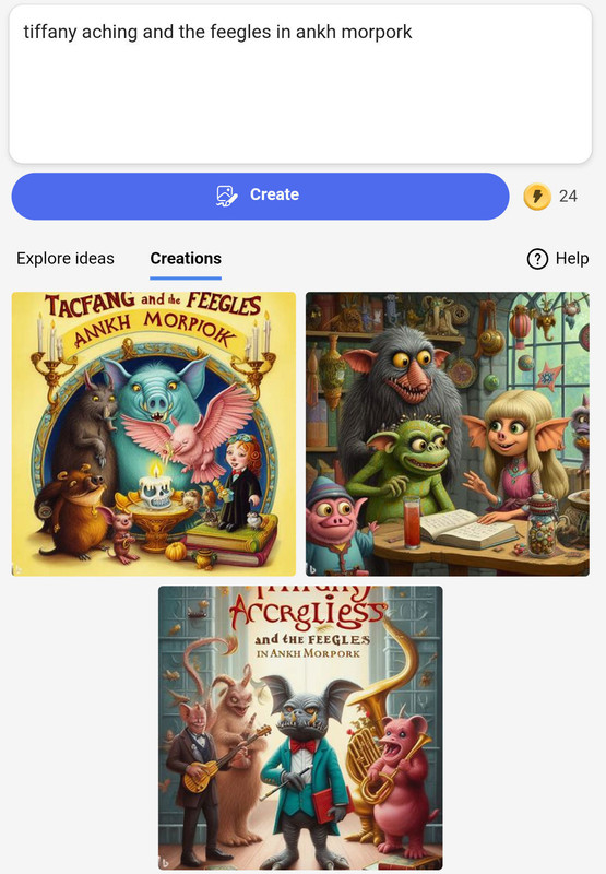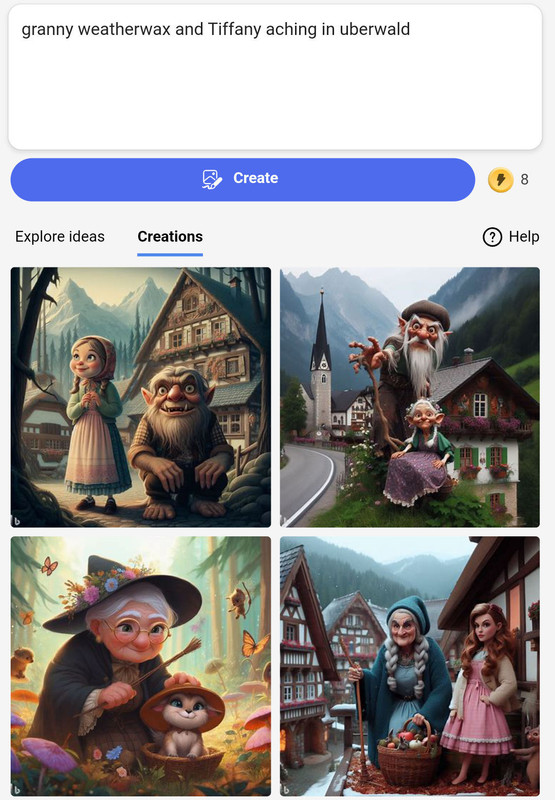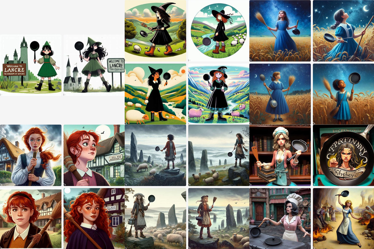 Continuing to play around with Bing/Dall-E 3 when I can find a prompt that doesn’t get censored. Was doing that yesterday when a bumped Discworld thread inspired me to try “Tiffany Aching in Discworld”. As I mentioned in my first post on DE3, each set of images has a distinct style/content that isn’t in other sets. It is clear that ChatGTP must be adding additional descriptions to each prompt behind the scenes without informing you. (In the last set of images on the bottom right I tried “Tiffany Aching in Discworld not holding a frying pan”.)