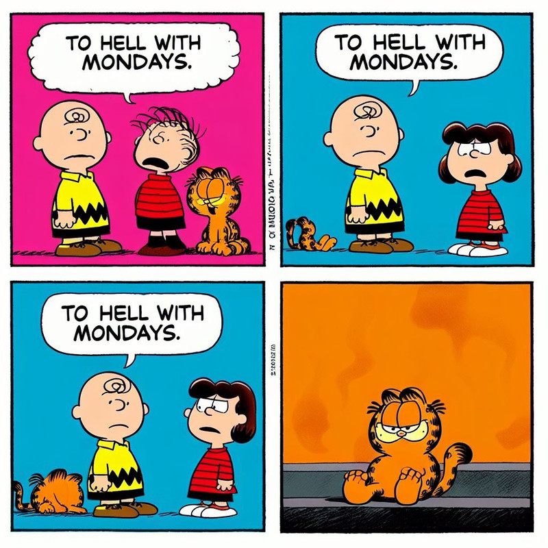 A four panel comic about Charlie Brown and Garfield saying “To hell with Mondays!” To each other.: