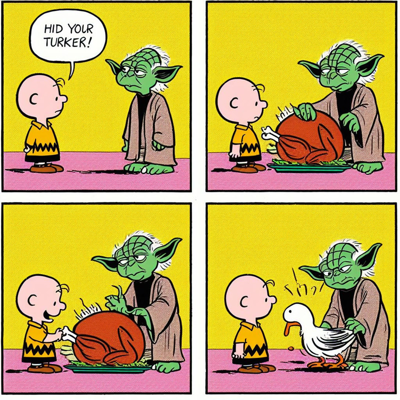 A four panel comic about Charlie Brown and Yoda learning to pluck a turkey.: