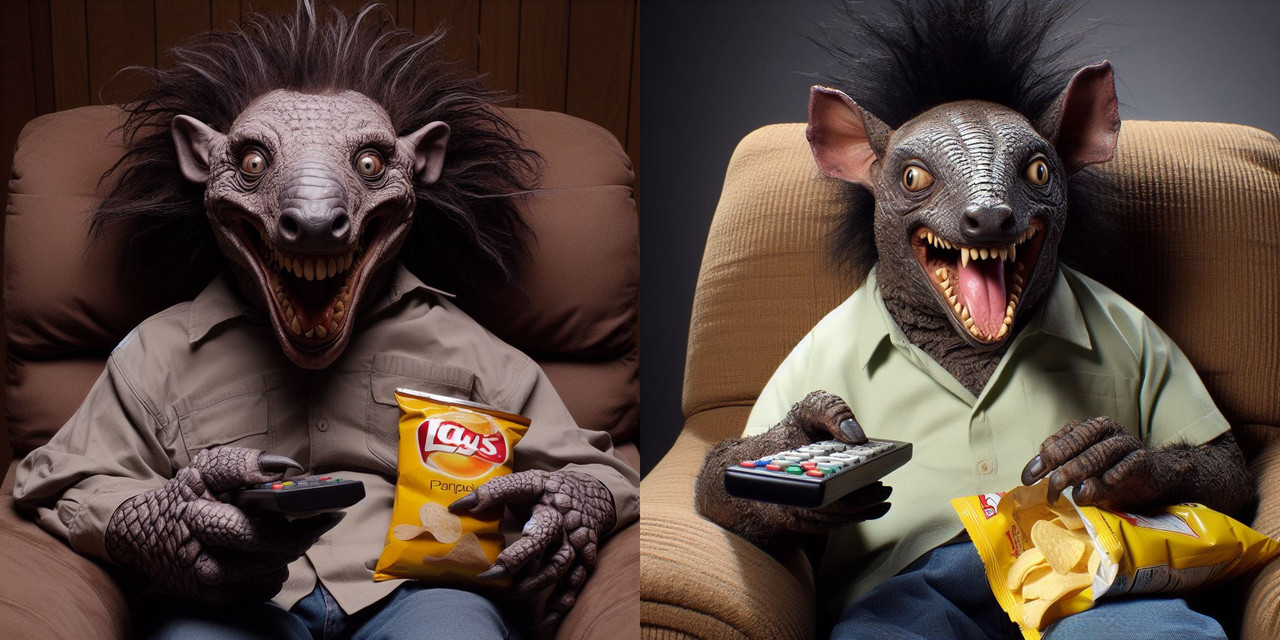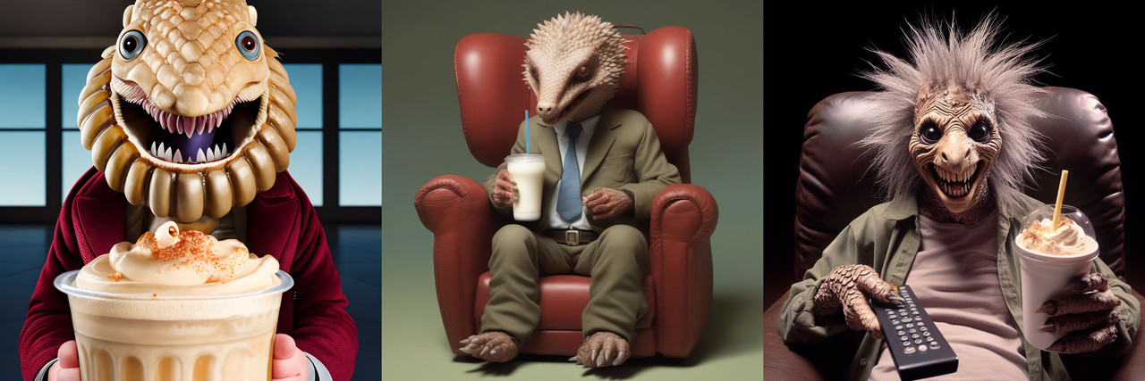 “Terrifying smiling human chupacabra pangolin hybrid with disheveled hair sitting in a recliner holding a remote control and a milkshake, by junji ito and mark ryden, birdseye view”