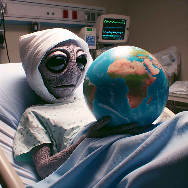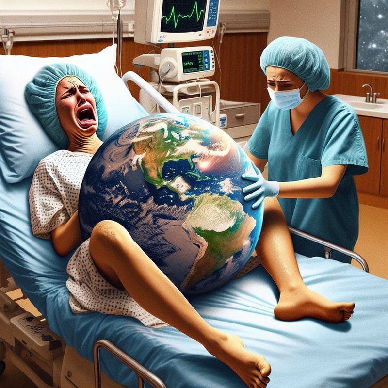 Just for the heck of it I ran the prompt that created the alien with baby Earth image (Photo of a very small planet earth in a hospital delivery room. Earth’s mother looks distressed.) through Night Cafe’s “coherent” model, one used through much of the early part of this thread. Here’s the result: