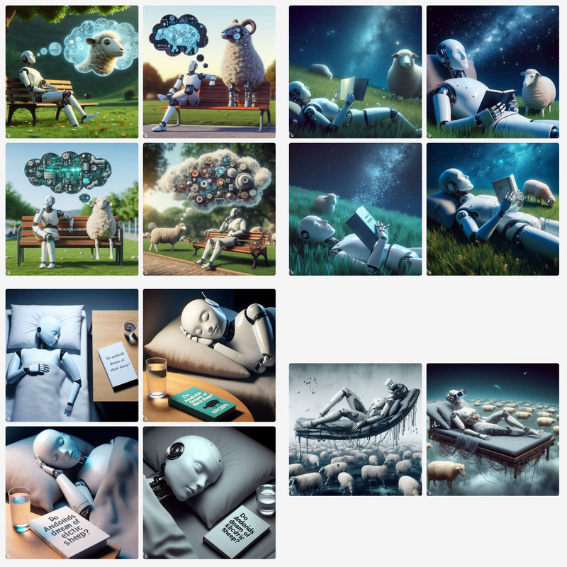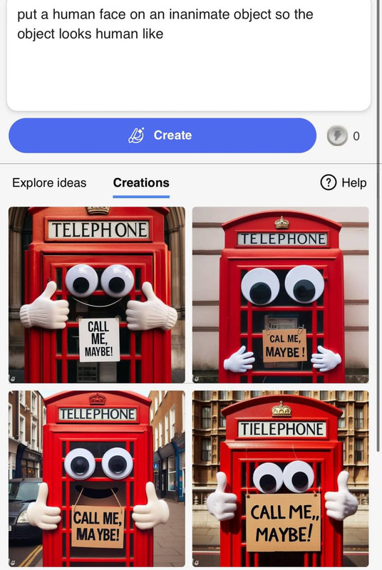 Use the same prompt and you will get utterly different (but related to each other) sets of four images. I ran it twice, once was four things that looked sort of like drawered boxes with antique telephone parts on it in face shapes and the other time was four line drawings of toasters with faces.