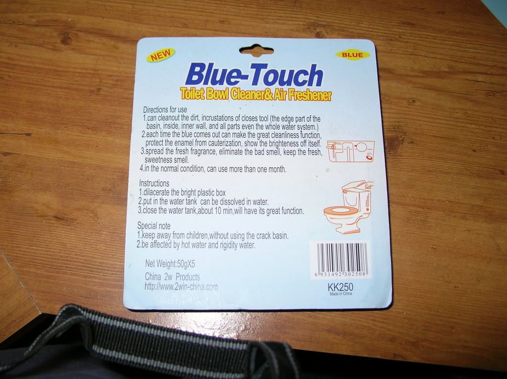 You know, as trippy as the Chinglish is, you can actually understand most of it. You cut a hole in the box, put the box in your toilet tank, and it cleans and descales your toilet bowl and tank. It won’t work as well if you have hard water (duh), and you should keep it away from children (also duh).