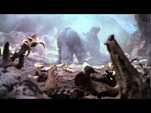 The T. Rex not only loses, it's dead, but it doesn't know it yet. In the 1950s film **the Animal World** ray Harryhausen collaborated with his mentor Willis O'Brien to give us a T. rex vs. triceratops battle that the Triceratops is doing better in, but the fight gets broken up by one of those inconvenient volcano eruptionsI fondly recall Dinosaurus with the T.Rex vs. steamshovel at the end (I own a copy of the film). I’m convinced that James Cameron saw it, too, and thet it inspired the duel between Ripley in the Loader Suit and the Alien Queen at the end of Aliens.