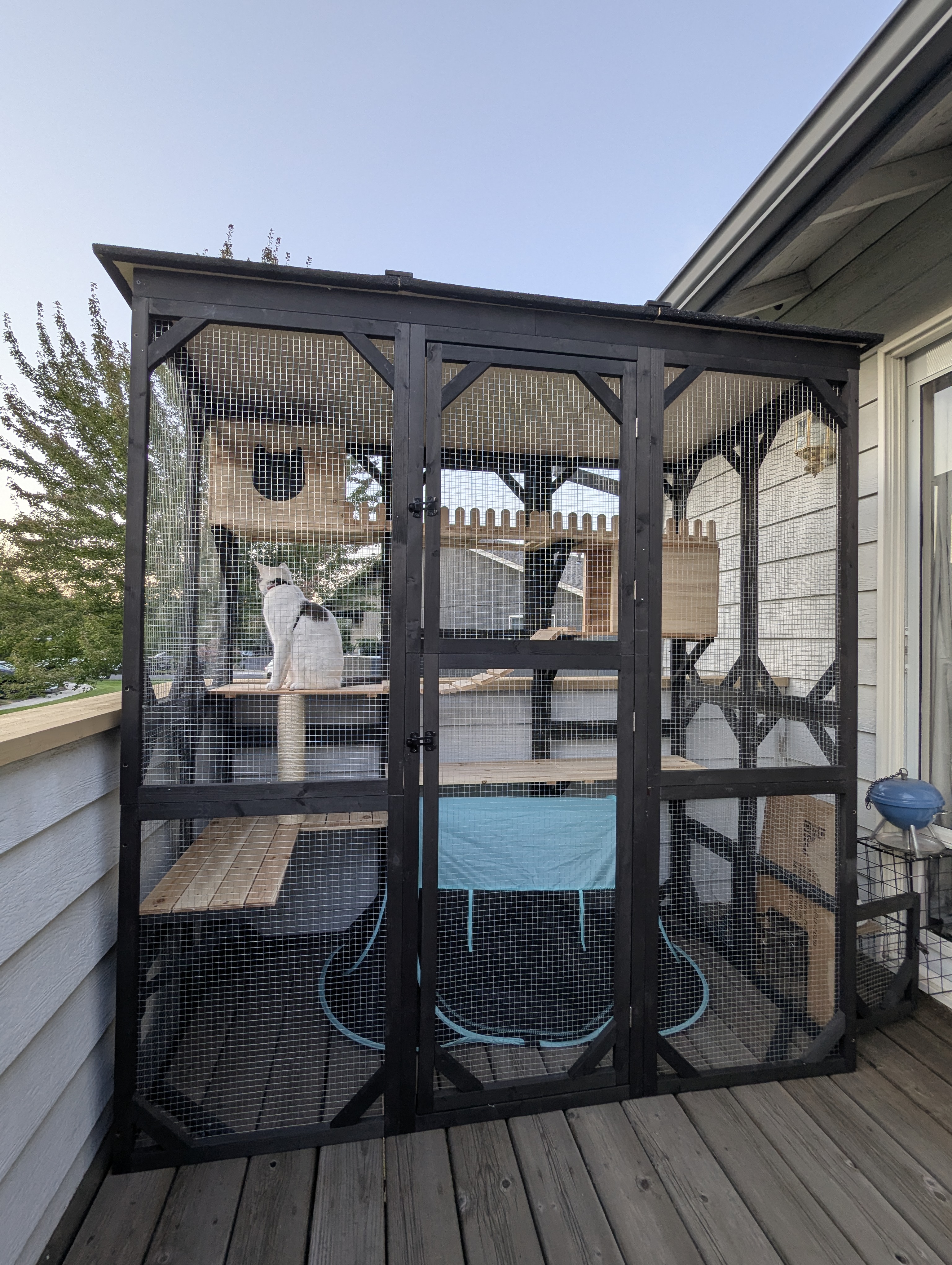 One of our summer projects is to build a catio (an enclosed wire mesh patio for the cat) around our back deck. There are numerous kits available online, as well as DIY blueprints.