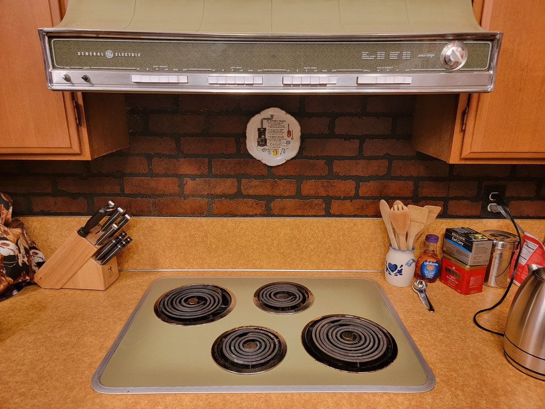 The cooktop. Note the avocado green color, the controls for the burners located on the vent hood and the faux brick “tile” behind it.