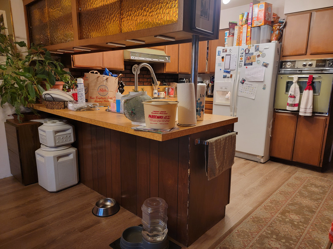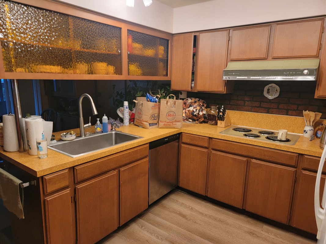 So from a strictly functional standpoint this kitchen needs updated. The cooktop and oven are original to the house (1967) and they are no longer relaible. The heat is very inconsistent. I asked the guy at the local appliance repair shop if the cooktop could be fixed and he laughed at me and told me that configuration didnt exist (I didn’t have a pic of it with me at the time). The fridge is 16 years old and leaks, and the dishwasher has an acrid chemical smell that emanates from it after it’s been ran. So all 4 major appliances need to be replaced.