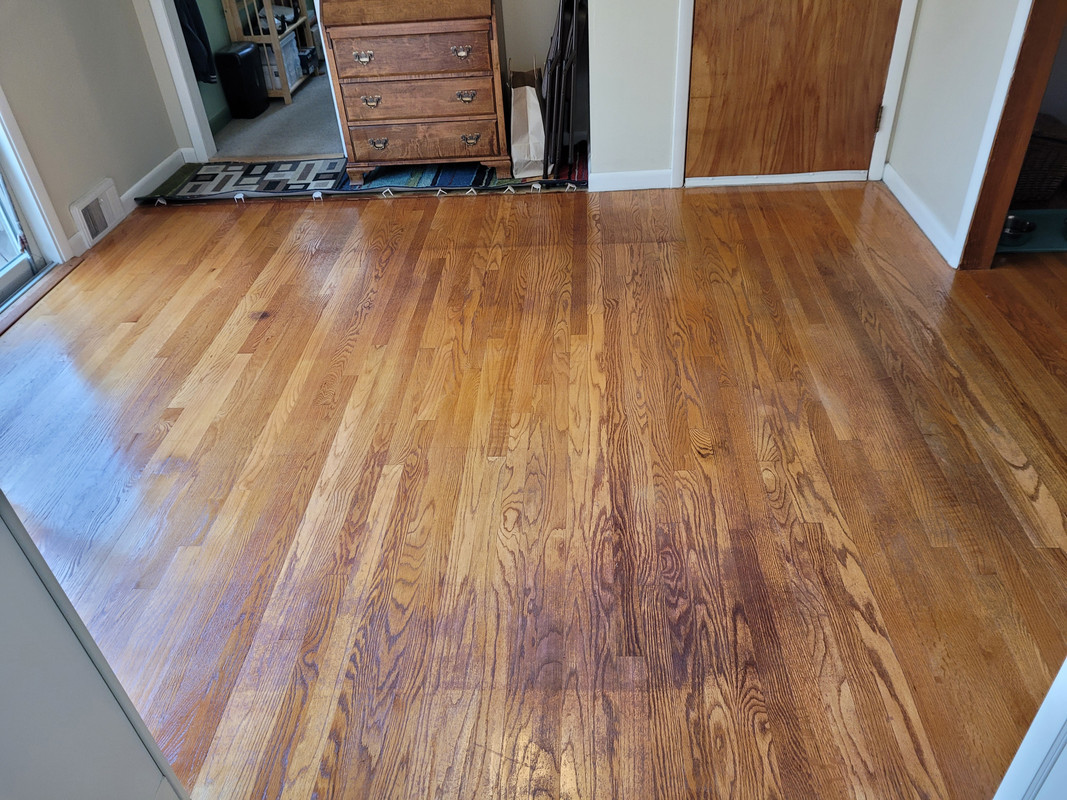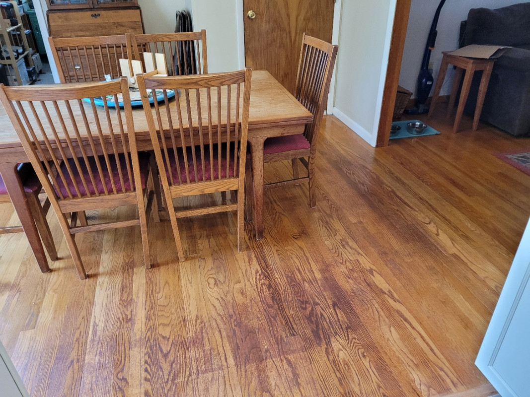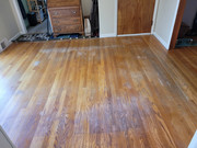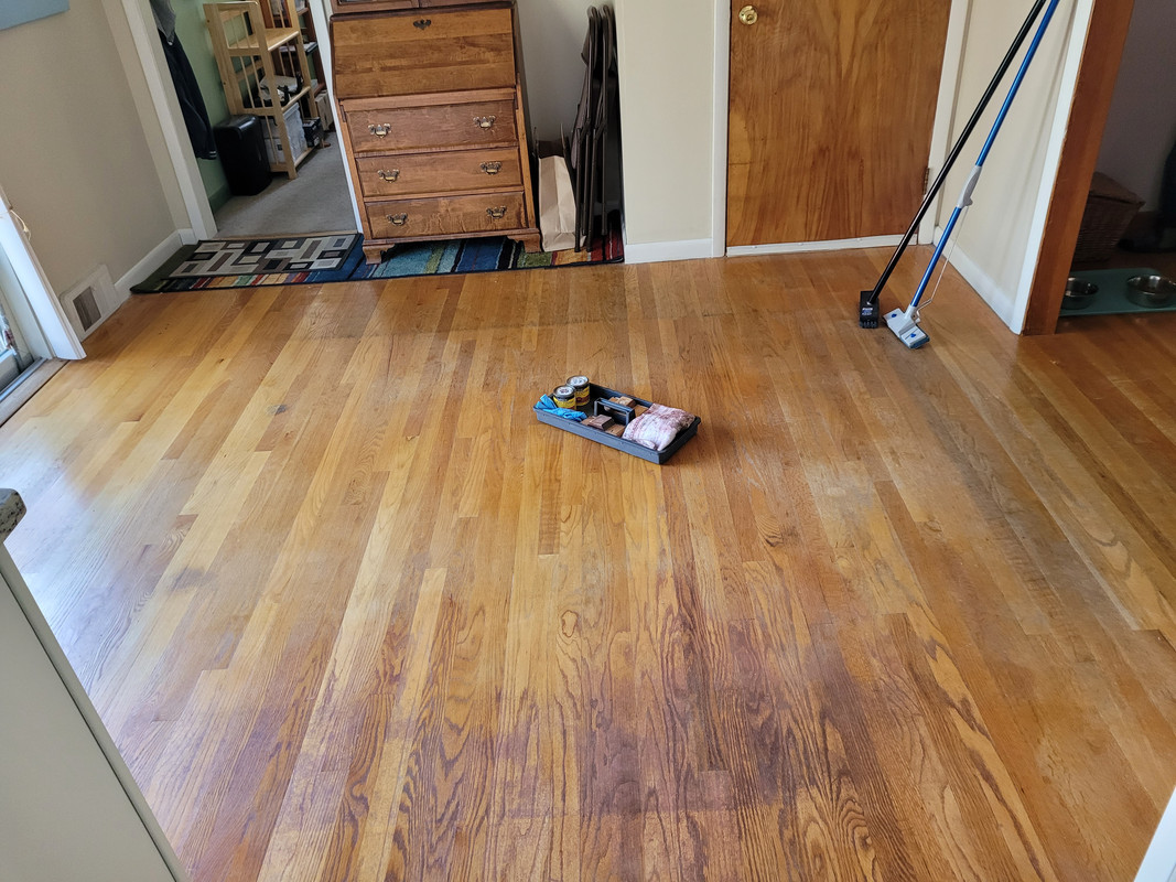 Cleaned it, sanded the bad spots, mopped again and stained. Buffed, buffed again later. touched up still bad spots and buffed.
