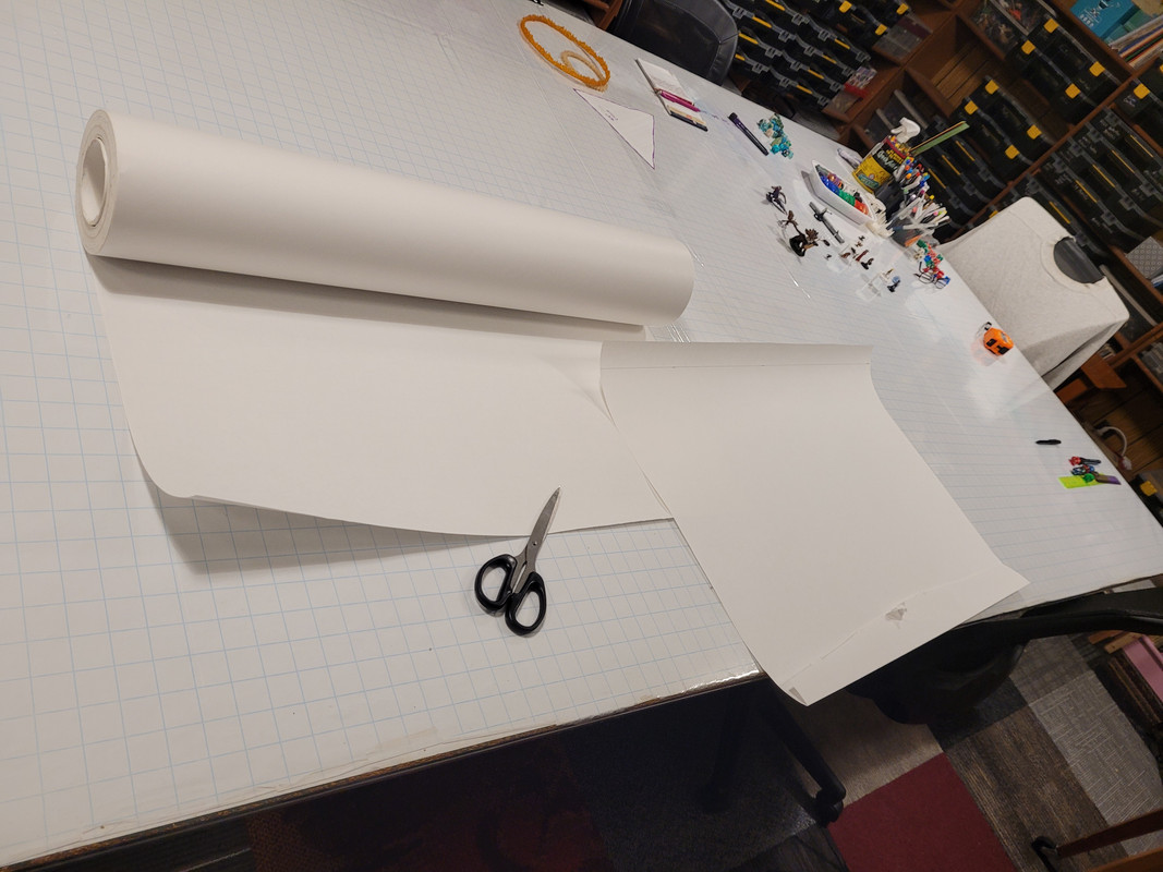 - one piece of 30"x23" butcher paper from my old roll folded and stapled to the back to brighten the shelves up.