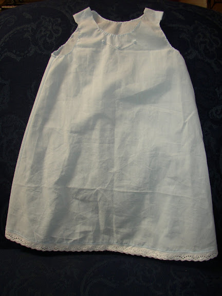Also because I’m proud, I just finished my very first baby daygown the other day. And I’m going to show it off now because I just can’t help myself. (You don’t have to click.) Daygown of blue batiste with smocking and embroidery. Slip with shell edge and embroidery.