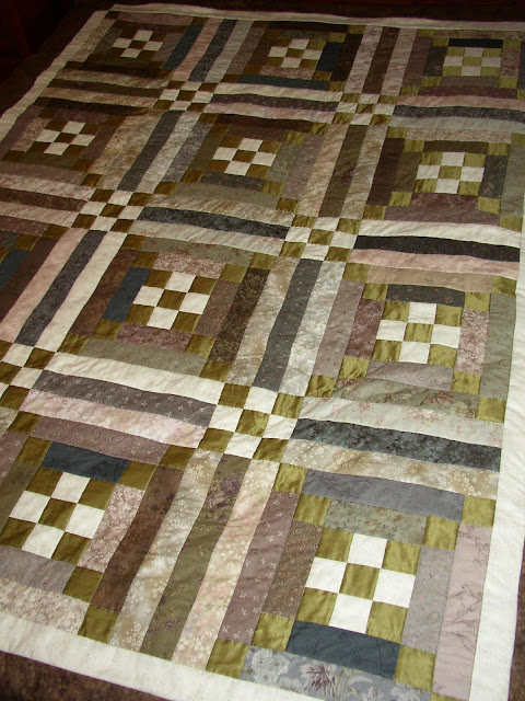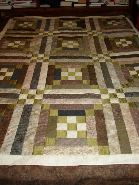 OK, I finished my taupe quilt. The pictures aren’t very good; it’s a twin size and hard to photograph well by myself. But here you go. Slightly different.