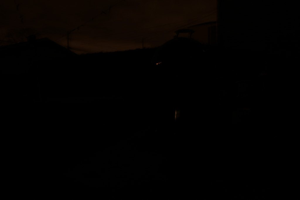 See how despite the long exposure, it’s still pretty much completely black? There is not enough light hitting the sensor at those settings to register much of an exposure. There is a little bit of information there, though. If I go into my editing program and artificially increase the exposure by 5 stops (this would be the equivalent of having about a 30 second exposure at those settings), you get this: