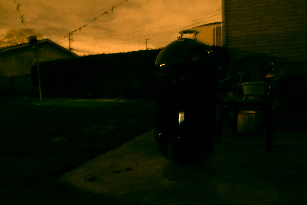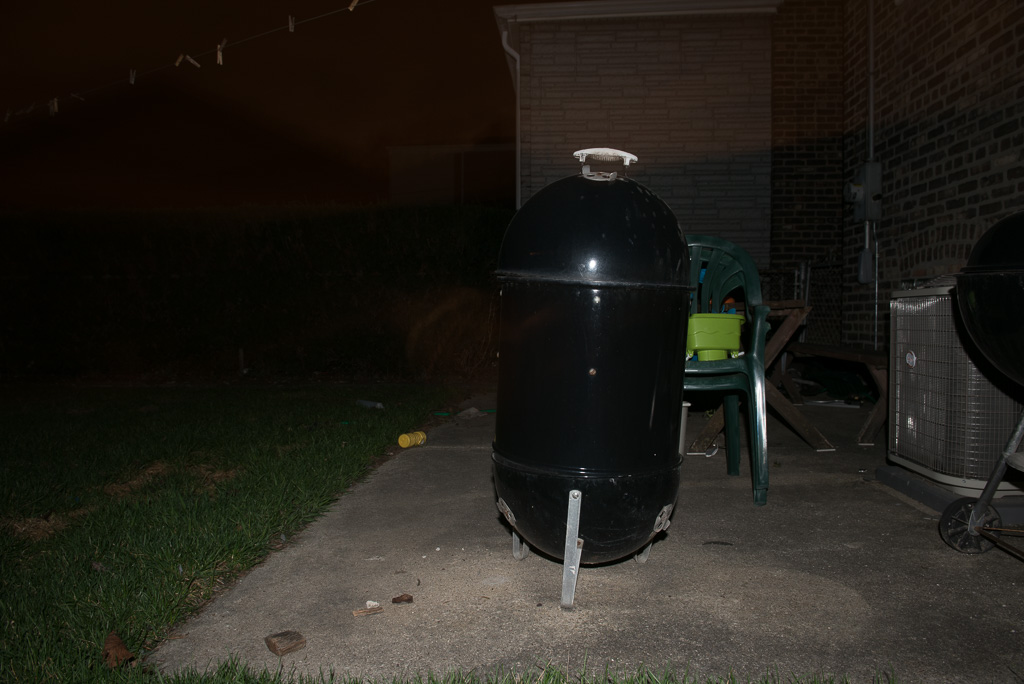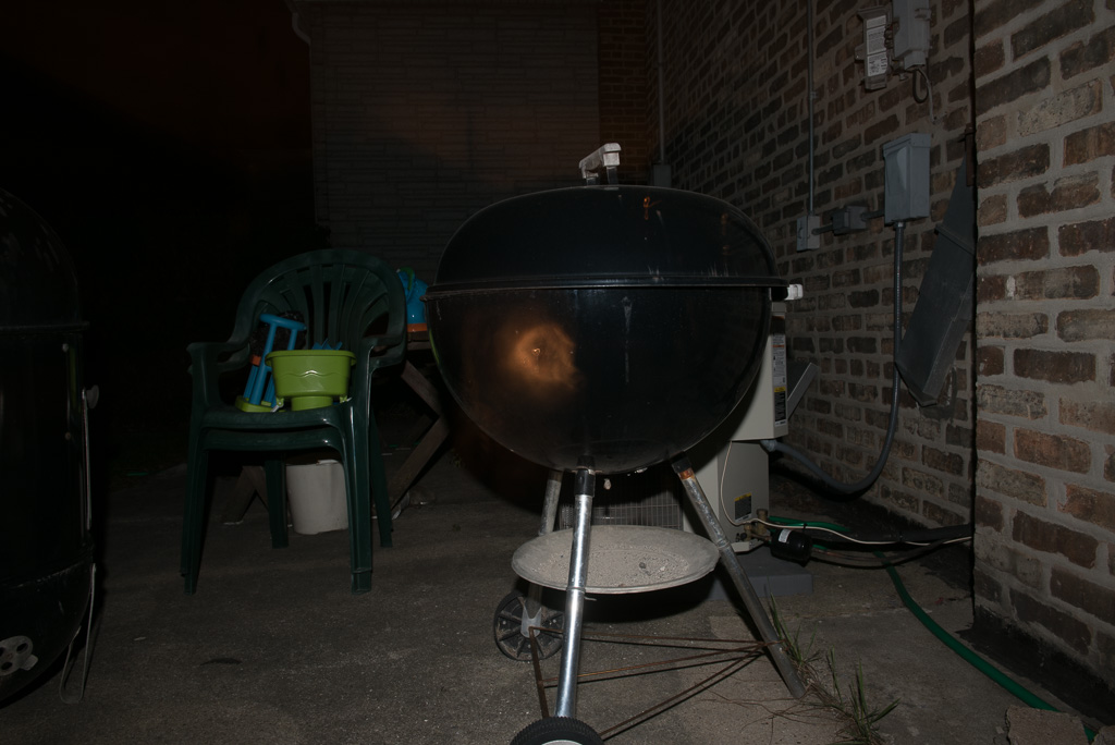 So, I described the outside as being “pitch black.” Now, living in the city, that’s not exactly true, but the amount of light falling on the grill and deck, etc., is pretty negligible. The EXIF info for the ghost dog photo is ISO200, f/14, 2 seconds of exposure.