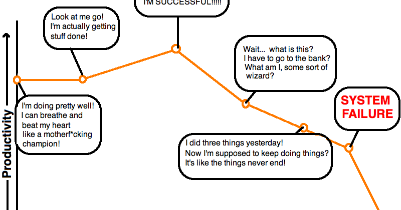 It’s cute, and I like it… But it isn’t quite accurate, because it fails to reflect the negative feedback effect. As we get pushed into attempting more and more tasks, yes, our productivity declines… But we also start pushing back, and turning down some of those additional tasks. We fail at some, while continuing to accomplish others. We usually don’t get to the “system failure” stage, but to a kind of partial success/partial failure situation.