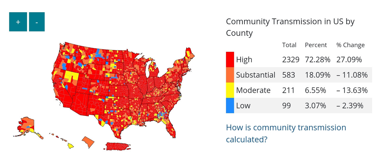 Are you looking at the Community Levels map (which many cynically think the CDC created to make things look better than they are)? Because this is what the current Community Transmission map looks like. Pretty much all the major population centers and most of the country are in the red. There’s some orange (for now), but the pockets of low or moderate transmission tend to be rural.