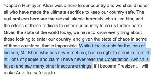 Why would I need to continually hear from Mr. Khan? Frankly, the only reason that we’re still hearing from him now, days after the convention, is because Trump can’t let shit go and keeps the story front and center. He had his speech, impressed America with how Muslim immigrants can be as hard-working, patriotic and giving as any other American and… that’s what he came for. Not to give us all weekly updates on what he’s up to.