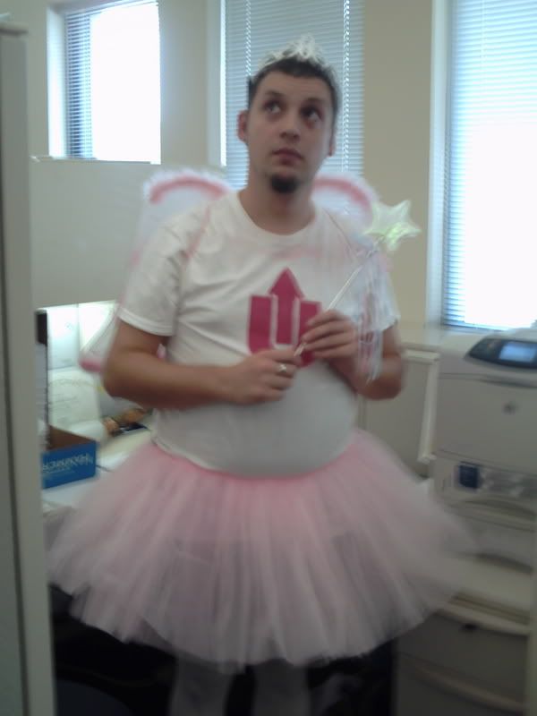 Me, http://i14.photobucket.com/albums/a309/daithilacha/PICT0007-1.jpg from last Halloween at the office. I have to figure out something better this year; I didn’t win the coveted $50 prize for “funniest costume.”