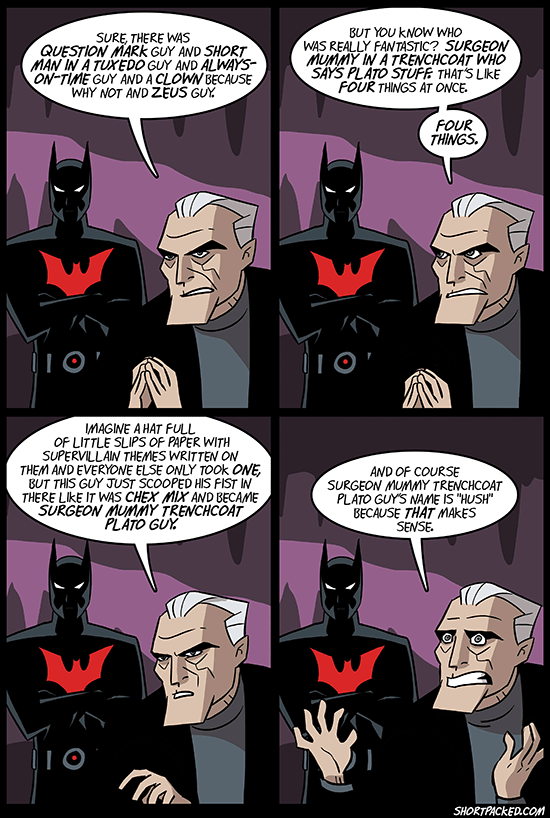 And, if you wanted to play up the comedic angle, Batman living in his parents’ basement. Or having to juggle a charade of mild-mannered Bruce Wayne and his duties as Batman when his folks are in-town visiting from Key West.