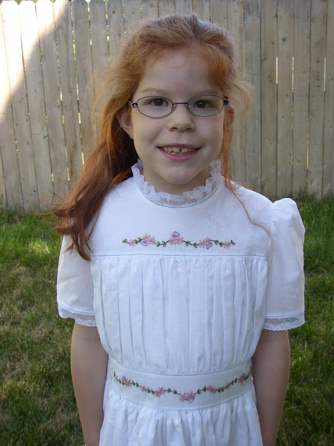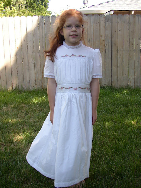 I finished the fancy white dress for a baptism. Here’s my little girl modeling it, and a detail of the bodice. Now she wants one just like it for next year! I would not have chosen to do the lace around the neckline, but that’s what the little girl wanted. I’m not entirely happy with all of the dress, but since I pretty much had to make it up, I’m quite pleased.
