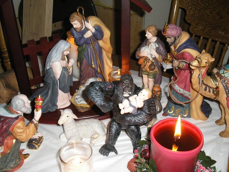 I’m quite certain I stole this photo from someone here on the Dope several years ago. It cracked me up so much that it’s the background on my computer every Christmas since. What I really love is that no one seems to notice that King Kong has absconded with the Baby Jesus.