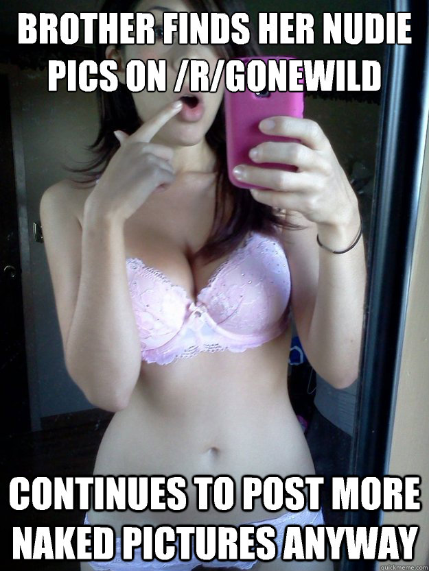 Anyone interested in the purely academic aspects of the phenomenon brought up in the OP would do well to search for a certain nina1987’s posts on reddit. There’s even a (non-nude, but probably NSFW-ish) meme picture about her and how, when her brother became aware of her numerous self-shot nudes on reddit, she started a thread there (paraphrasing) “OMG my brother found out!” with a new set of attached nudes.