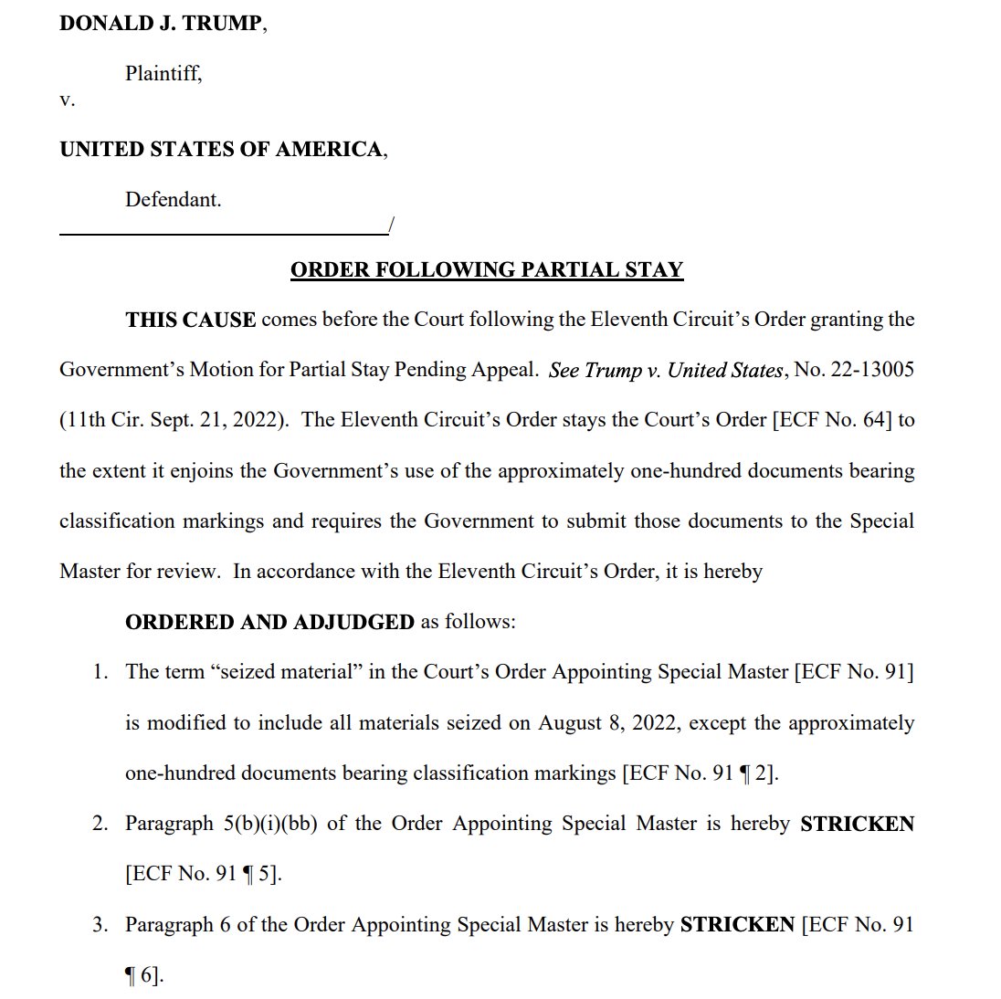 She strikes the part of her order which allows the Trump team access to the classified docs.