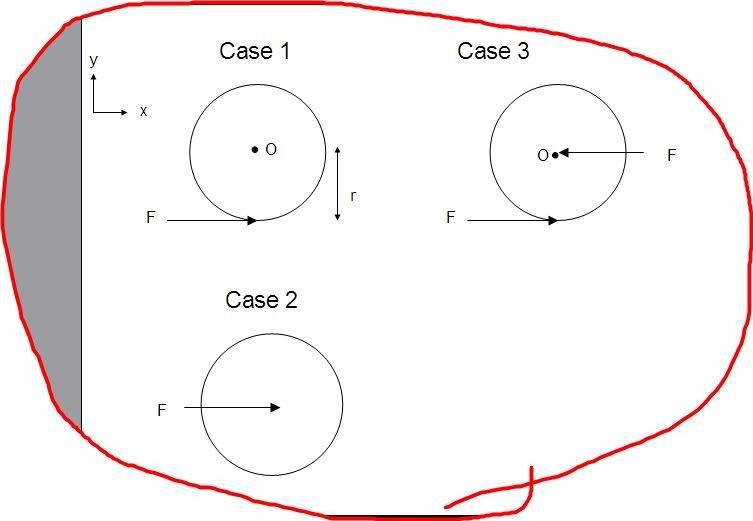 Does Case 1 accelerate rotationally any different from Case 3? If so, please state exactly what the torque around the center of mass is for each case.