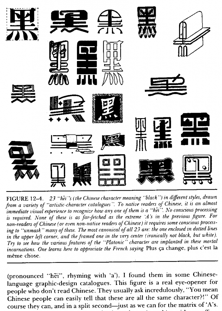 Martin Gardner, in his book “Gödel, Escher, Bach” explores how the human mind works and one thing he explores is fonts. What is the essence of the letter “a” that is captured by the different fonts. A lower case a with a handle on top is very different from the rounded a with no handle (like in Comic Sans) and yet we have no trouble identifying them as the same letter. He then explores fonts in other languages and has an entire page filled with the chinese character 黑 (black) in different fonts. For a westerner it my be difficult to see them all as representation of the same thing but a chinese person would immediately identify them as such.