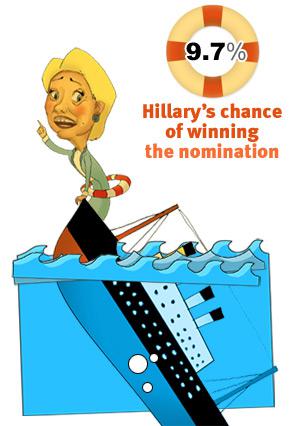 Salon’s Deathwatch currently lists Hilary at 9.7% chance of survival. (The started at, in their words, a “generous” 12% but have dropped it down due to Casey and Klobuchar’s nominations and Obama’s continued rise in the polls.)